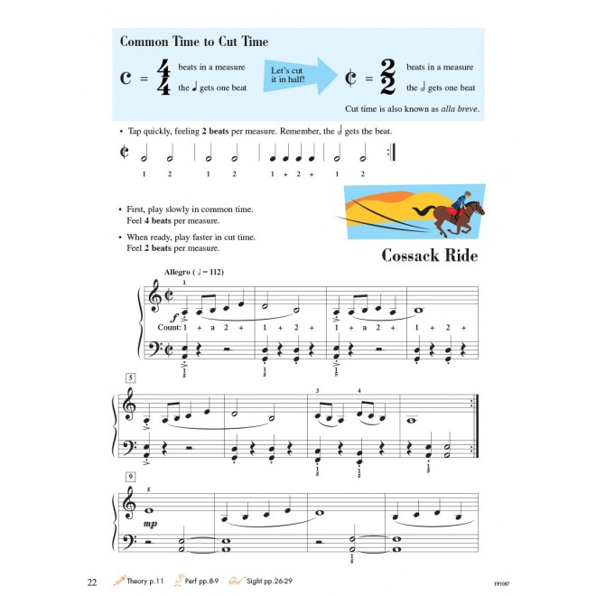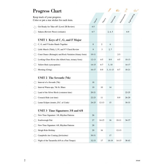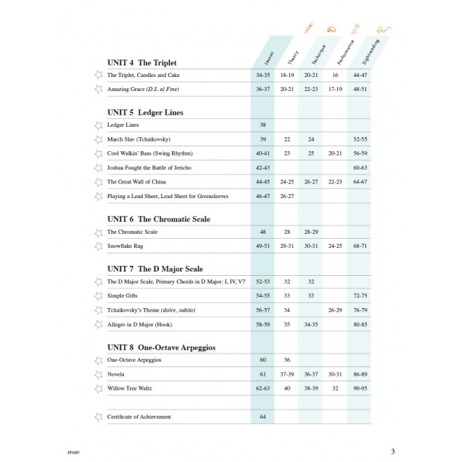 Level 3A introduces 3/8 and 6/8 time signatures and the triplet. Students learn the chromatic scale, the 7th, one-octave arpeggios, and explore the key of D major. Contents include: Amazing Grace • Campbells areComing • Cool Walkin' Bass • Cossak Ride • Echoes of the Harp • Eine Kleine Nachtmusik • Ice Dancing • Joshua Fou ght the Battle of Jericho • Land of the Silver Birch • Looking-Glass River • Lunar Eclipse • March Slav • and more.