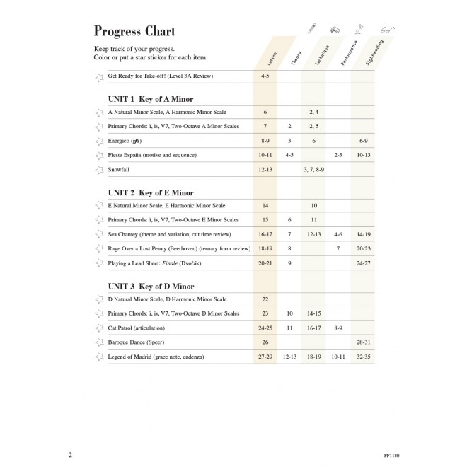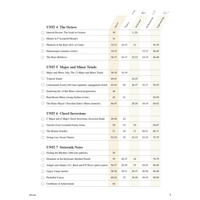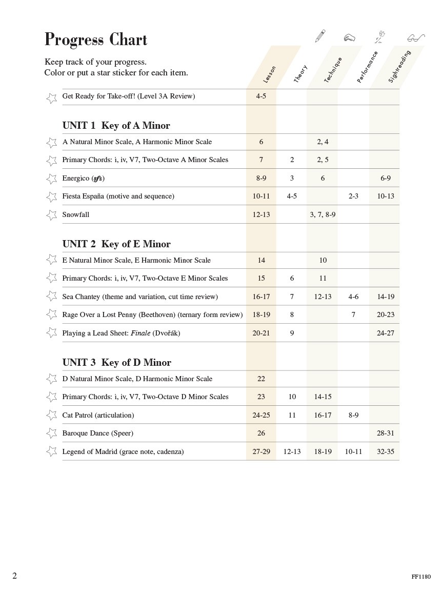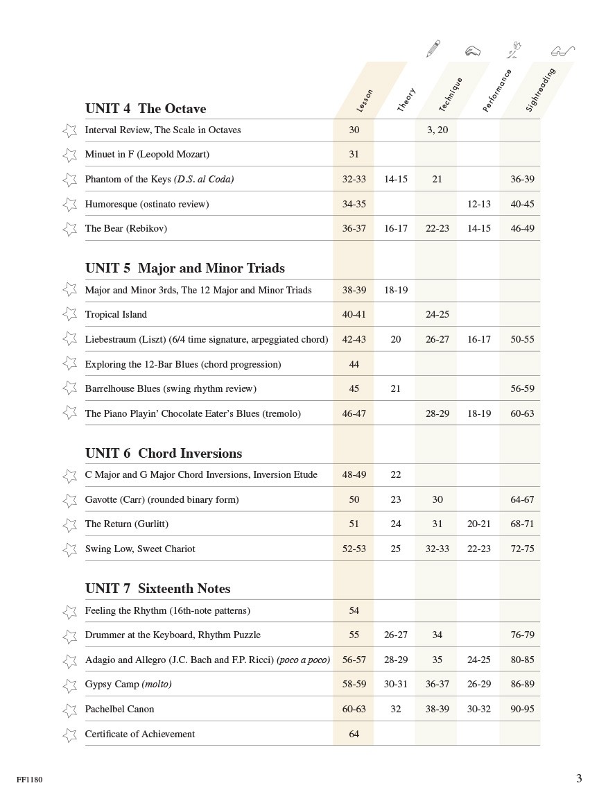 Level 3B continues to build musicianship with challenging and motivating pieces. Concepts include the octave, A minor and D minor scales (natural and harmonic minor), motive and sequence, all 12 major and minor triads, triad inversions, syncopation, and introduction to sixteenth notes. Contents include: Andante • Drummer at the Keyboard • Fiesta Espana • Gavotte • Highland Jig • House of the Rising Sun • Humoresque • Snowfall • Minuet in F • Pachelbel Canon • Phantom of the Keys • Rage Over a Lost Penny • Sea Chantey • Swing Low, Sweet Chariot • and more.