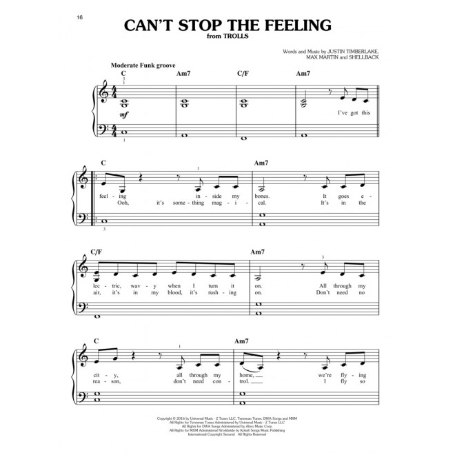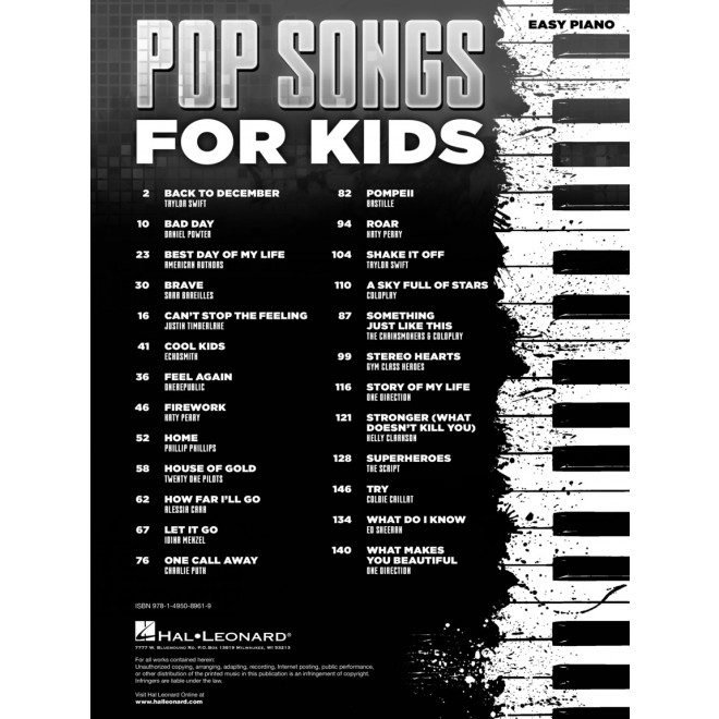 Kids from all corners of the world love and sing along to the songs of Taylor Swift, One Direction, Katy Perry and other pop stars. This collection features 25 songs from these and many more artists in easy piano format. Includes: Brave • Can't Stop the Feeling • Firework • Happy • Home • Let It Go • Shake It Off • What Makes You Beautiful • and more.