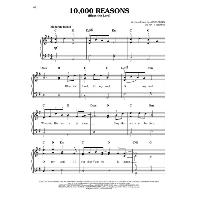This updated edition offers 17 contemporary worship favorites, including: Blessed Be Your Name • Forever Reign • Hosanna (Praise Is Rising) • Mighty to Save • One Thing Remains (Your Love Never Fails) • Our God • 10,000 Reasons (Bless the Lord) • and more!
